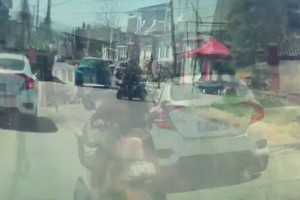 大妈三轮车失控,撞上路边停放车辆
